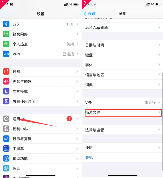 2、进入手机设置,下拉找到【通用】-【描述文件】: