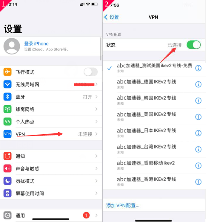 4、安装成功后,回到设置,在这里找到【VPN】,选择线路连接即可使用(免费体验用户只能连接测试线路)。