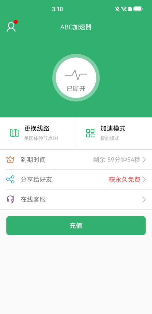ABC 加速器是可以给用户提供免费试用的,但是试用期很短,你可以利用这一个小时,对 ABC 做一个初步的了解,去看看到底是不是能上外网,挑个视频看看网速啥的,有个基本的概念。