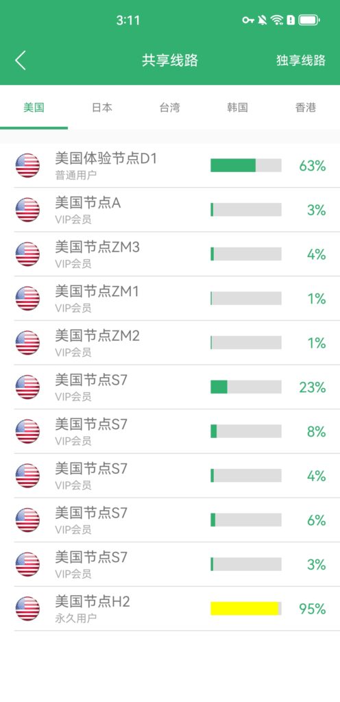 • 不同线路的网速有较大差距:优先推荐你使用美国线路,日本线路次之,台湾和韩国线路大家在非必要时刻就不要考虑了,免得自讨没趣;