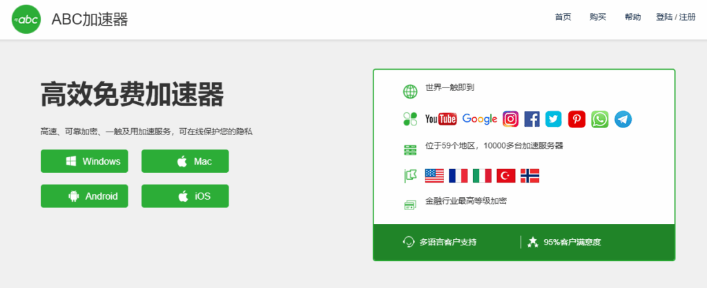 • 各个设备都能用:ABC 加速器支持 Android、iOS、Windows、Mac,很全面;