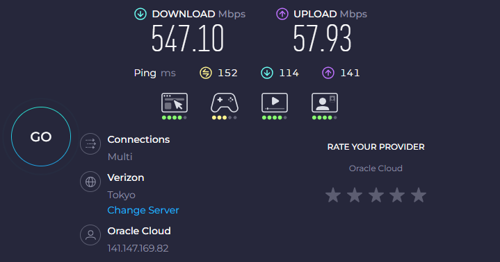 其次,我测试了日本线路,下载速度 547.10 Mbps,上传速度 57.93 Mbps,这个下载速度比起没有连接外网时候,算是有一个明显的下降,但是从专业角度来看,这个波动仍然属于正常范围,只是说日本线路的表现居然没有美国线路表现好,这倒是挺稀奇,因为日本线路属于我们亚洲地区,从过往我对加速器的评测结果来看,这种什么新加坡、香港、日本的线路,网速都是要远远快于美国澳大利亚这样的欧美地区的。