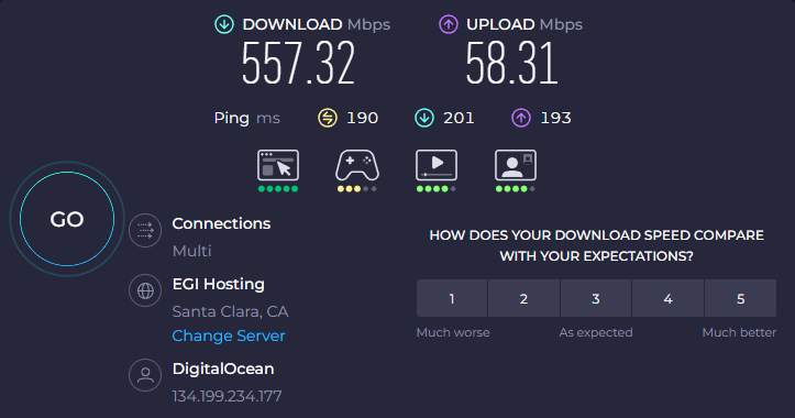 首先第一条,我选择了美国线路进行测试,测试结果为下载速度 557.32 Mbps,上传速度 58.31 Mbps,这个速度比起我们没连接外网的时候其实没下降多少,这种层面的波动几乎完全可以被忽略不计,上传速度非常稳定: