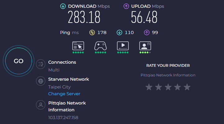 那么既然说到这里了,我就也顺势测试了一下台湾线路下载速度为 283.18 Mbps,上传速度是 56.48 Mbps,这个数据结果就明显是很差了,下载速度降了一倍不止,这个数据网络延迟也会变高,作为一个离大陆如此近的 IP,网速数据居然是这个结果,实在是非常反常了: