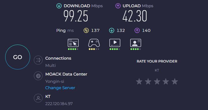 最后,我选择了另一个亚洲国家线路进行测试,韩国线路,这个数据更是差的没边,下载速度只有 99.25 Mbps,上传速度 42.30 Mbps,且不说下载速度居然已经降到两位数了,就这个上传速度,在过去我的所有网速测试中,几乎不会有多少线路会影响到上传速度,但这个韩国线路居然能影响到,就出于这个结果反馈,我个人是建议大家不到非用不可的地步,不要连接韩国线路。