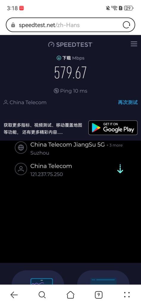 那么首先是我没有连接加速器的网速,下载速度 579.67 Mbps,Ping 10 ms: