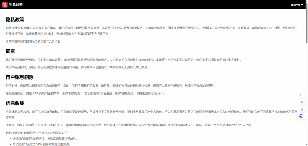 狗急加速器官网内提供了一些隐私性的相关说明,不过我觉得像这种东西大家图一乐就好了,因为看起来实在是太像那种网上 copy 来的套话了。或者换句话说,它写是这么写,但事实上我真的能看见的隐私政策是一点没看到,比如说用了什么加密协议?是不是无日志政策?诸如此类它都没有。