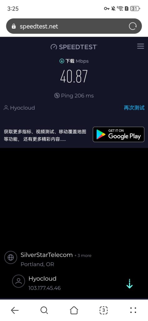 在连接了加速器之后,我等待了一会时间,确认连接稳定了,又一次进行了测速,获取的数据为 下载速度 40.87 Mbps,Ping 206 ms,这个数据同样使用的是华为设备,电信 WiFi 网络,连接的线路节点为美国线路。