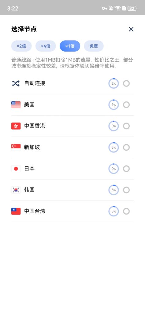 然后就是普通线路,使用 1 MB 扣除 1MB 的流量,这个也算是字面意思,你能选择的线路有美国、香港、新加坡、日本、韩国、台湾这六个国家地区,覆盖范围小是小了点,但是也完全够用,日常没问题: