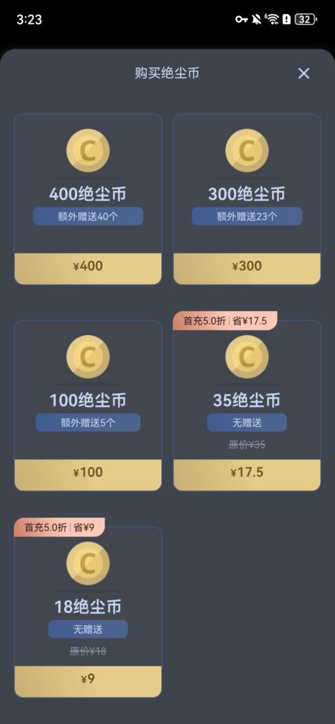 你要做的,就是先去购买“绝尘币”,这个感觉有点像你充Q币,常规的比例是一比一,新人首充35/18这两个档位可以享受半价折扣,像300/400这样的就是你买的越多,赠送的币也越多:
