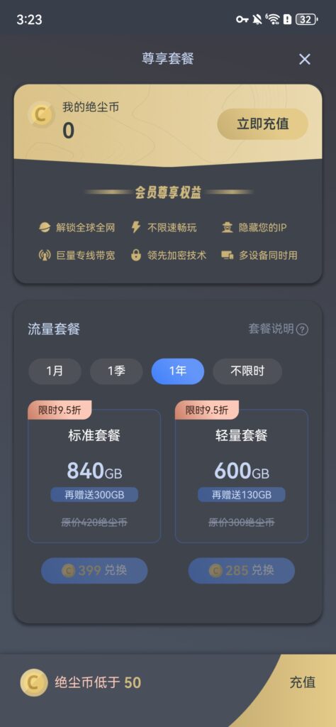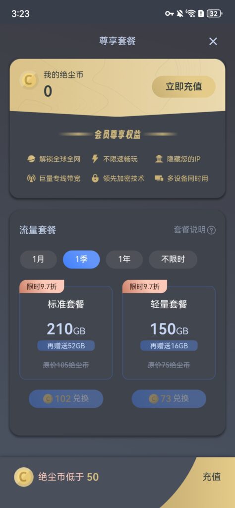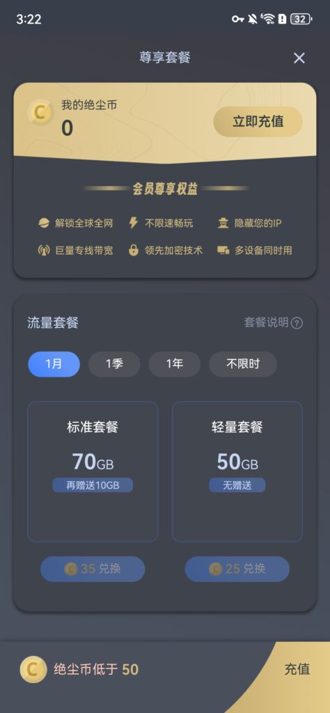 就拿最简单的月会员来说,如果你觉得50G流量你够用了,那你就是只需要25币(但是绝尘加速器里不提供25币的充值入口,你只能硬着头皮充35的,然后留下来十个币);如果你觉得70G流量才够用,那你就直接充35的币。