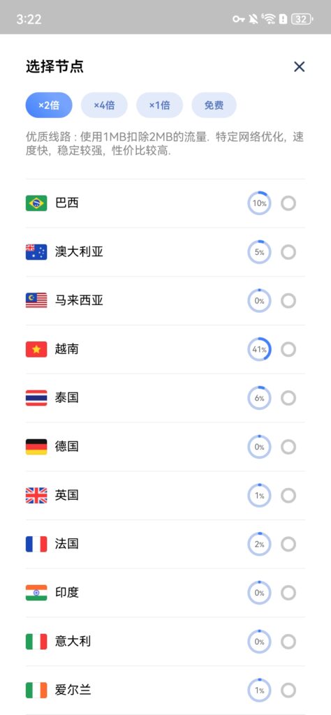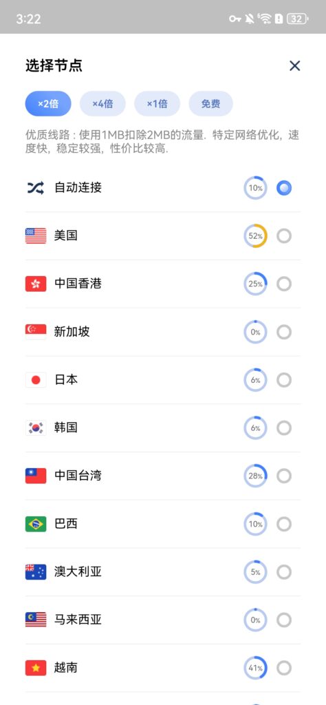 再来,就是优质线路,使用 1 MB 扣除 2 MB 的流量,这表示你实际用掉1MB的数据,但系统会额外多扣出1MB的流量,合计就是总共扣你 2 MB,也就是说你的用量被放大了。就是因为这个线路能提供给你所谓更快更稳定的优化服务,所以你的流量也要加倍支出。
