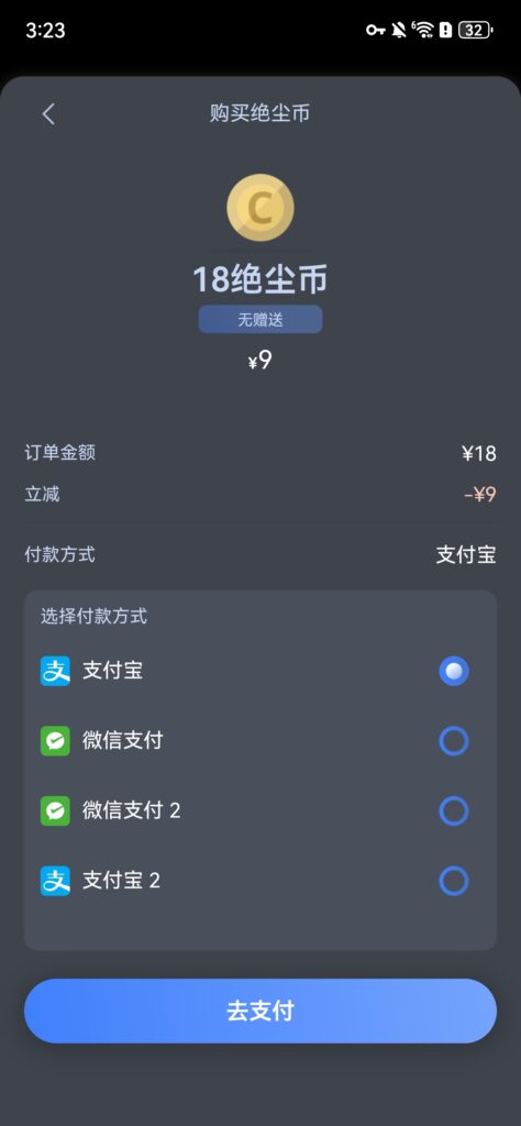 所以对于这个套餐模式,我个人先打个问号吧,我不是很赞同,但当然,你也有支持的权力,如果你觉得合适,那就买它!你可以在应用内进行支付,绝尘所支持的付款方式包括支付宝、微信,对国内的用户来说也够用了。