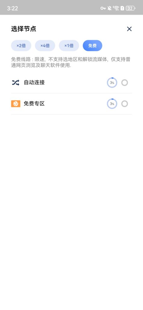 服务器方面,绝尘加速器模式同样也挺特殊的,首先是免费体验的用户,你只能使用免费专区线路,这个服务器 ip 一般是随机的,你也没的选: