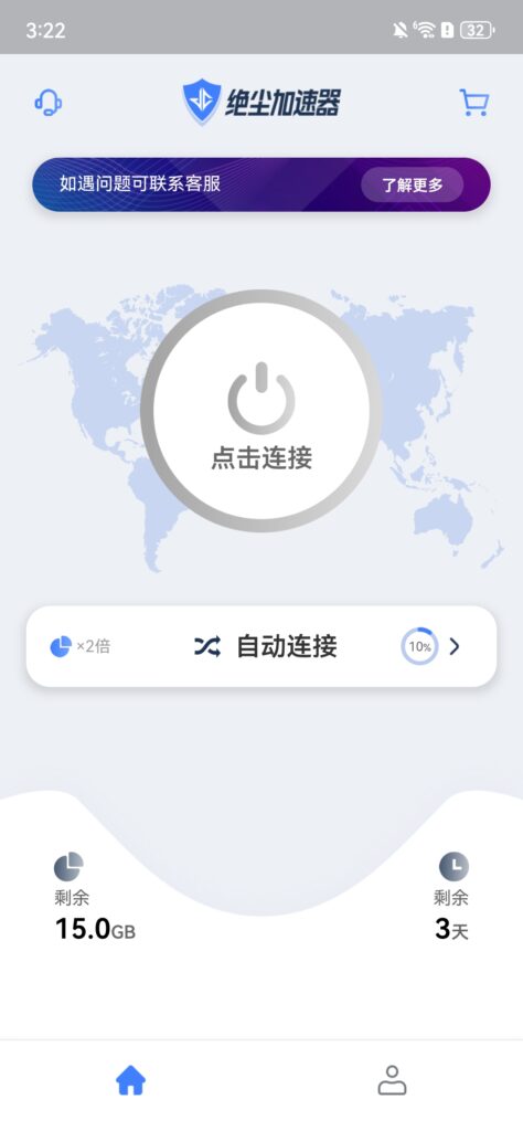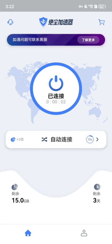 既然是收费工具,那起码的就是得给用户一点体验时间,不然大家咋知道你这个工具好不好用。绝尘加速器可以给新用户 15 个G的体验流量,限 3 天内使用,要是流量用完了或者3天过去了,那试用就是自动没了,后续也没有别的白嫖机会了。