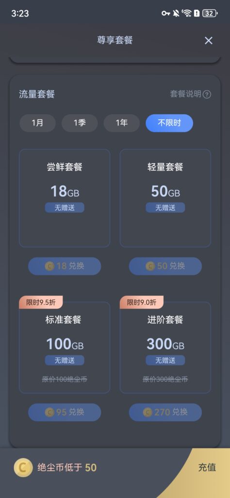 买了这个币之后,你就可以来进行消费了,绝尘加速器在时间上划分了四种套餐,一个月、一个季度、一年、不限时,然后每一个时间套餐都还有不同的流量选项可以选,所以这综合一起看下来,你能选的选项还是非常多的: