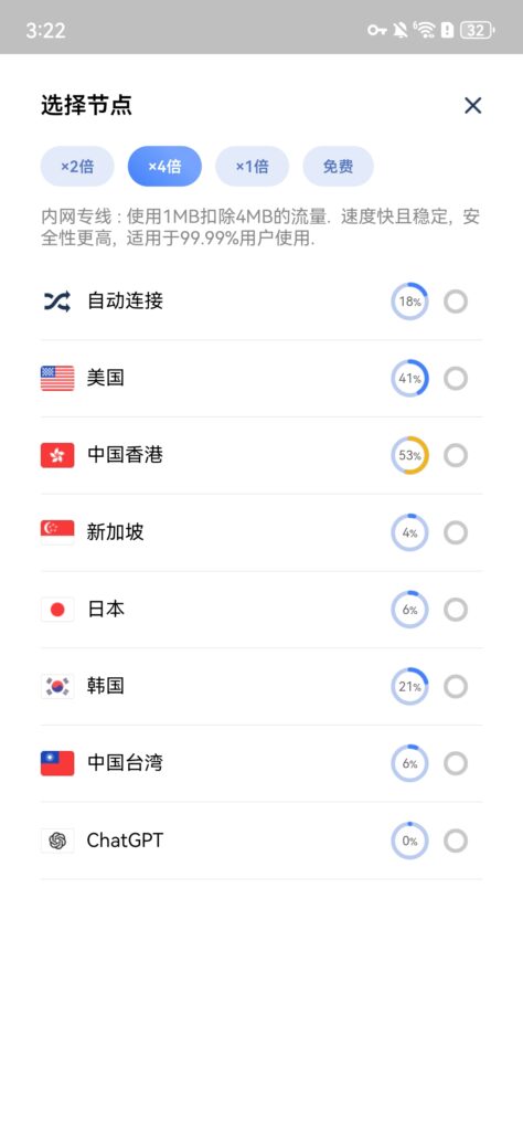 最后就是内网专线了,使用 1 MB 要扣除 4 MB 的流量,同样是有六个线路能给你选,但还额外提供一条 ChatGPT 线路,我个人觉得绝尘在 ChatGPT 上的作用还是挺一般的,仅供参考吧。