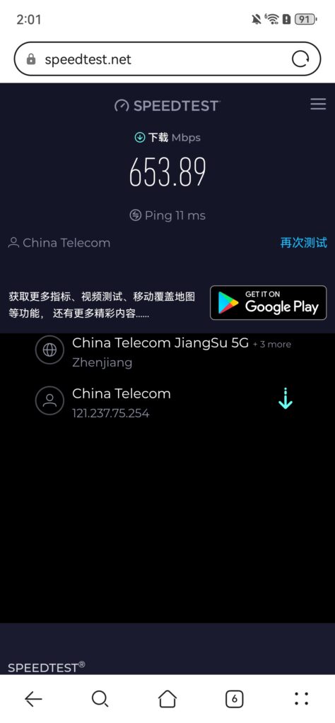 在没有连接加速器的时候,我的基准网速为下载速度 653.89 Mbps,Ping 11 ms,这个测试我使用的是国内的电信网络,华为设备。