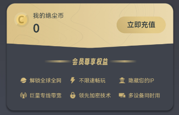 所以接下来就是绝尘的价格问题了,绝尘加速器的模式是比较特殊的,不像别的加速器、你直接支付一笔钱,就能直接开一个月会员,绝尘有自己独特的支付模式,这里有一种“币种”——“绝尘币”。