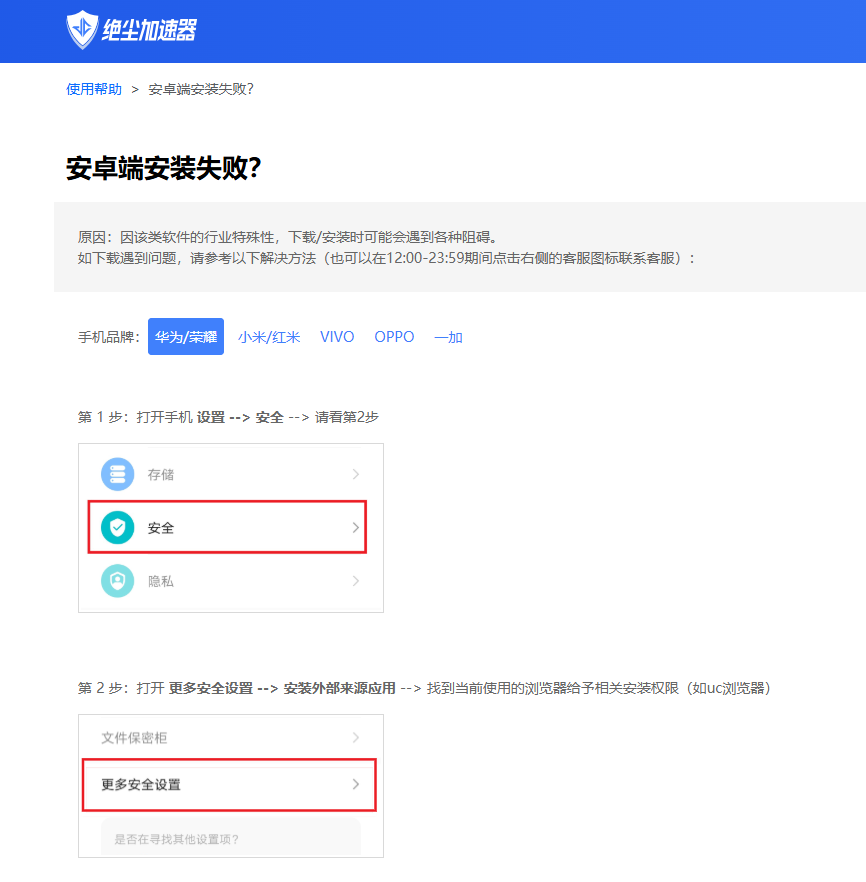 如果你在下载安装的过程里出现了问题,你可以直接去看官网里面的说明,针对不同的手机品牌,官网都给出了比较全面的操作解法了: