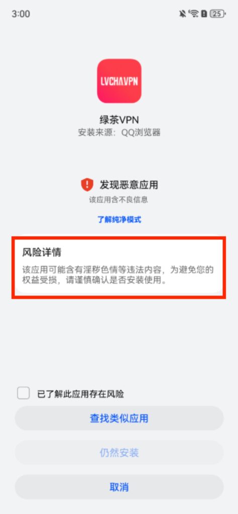 除此之外,我在下载安装评测绿茶加速器的过程中,大家可以看到图上的提示,手机是会反复提醒我此应用存在危险、并将其标记为“恶意应用”的,下方的文字说明也很清晰:该应用可能含有yhsq等违法内容