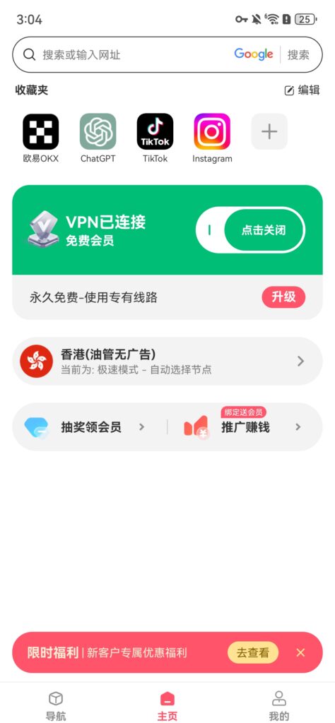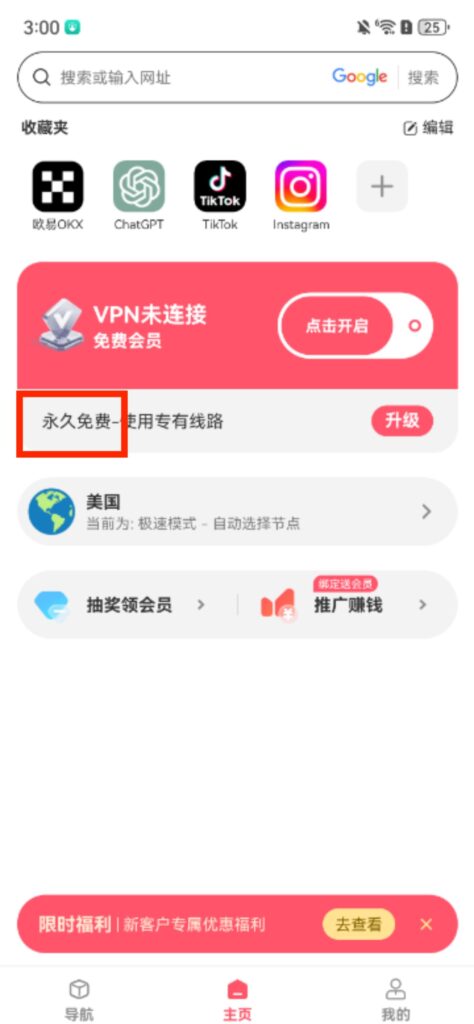 在应用内,你也可以看到里面随处可见【永久免费】的字样,只是永久免费用户,你只能连接专有线路(其实专有线路也不少了,这个在后面我会详细说):