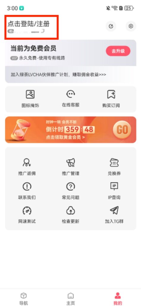 安装成功后,打开应用。绿茶会直接分配给你一个用户账号,如果你只是来体验试用、或者只打算白嫖的话,那你就直接用这个账号就行。但如果你以后在绿茶里面付费了、要长期用,那我还是建议你注册一个个人账号会比较安全,注册方法也很简单,只要你自定义账号和密码即可,无需绑定手机号邮箱、