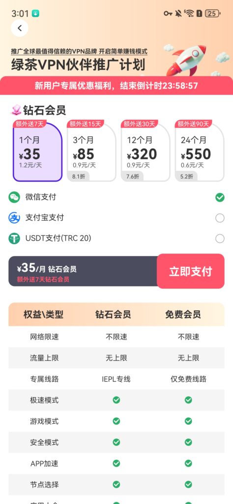 选定你要购买的套餐,就可以在应用内直接支付了,绿茶加速器支持微信、支付宝、USDT 付款,对国内用户来说也是挺方便的。