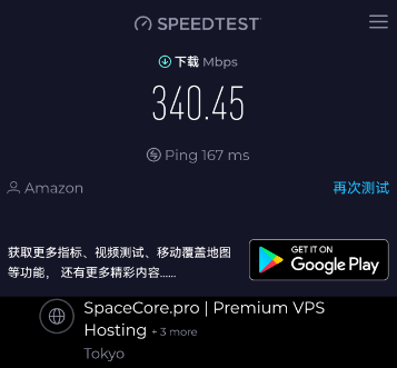 第一次测试,我连接到日本线路,获得的网速数据为:下载速度 340.45 Mbps,Ping 167 ms