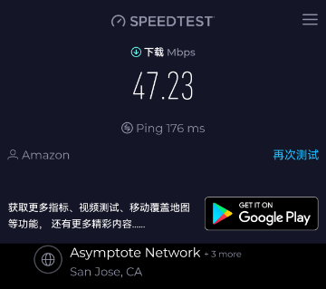 第二次测试,我连接到美国线路,下载速度出现了一个明显的质的下降,下载速度 47.23 Mbps,Ping 176 ms;