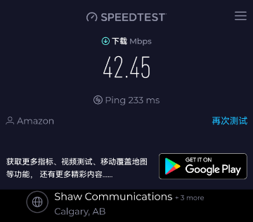 第三次测试,我连接到加拿大线路,此时延迟也有了明显变化,下载速度 42.45 Mbps,Ping 233 ms;