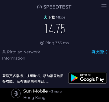 第四次测试,我连接到中国香港线路,这是网速和延迟变化最明显的一个,测速数据比较糟糕了,下载速度 14.75 Mbps,Ping 335 ms。