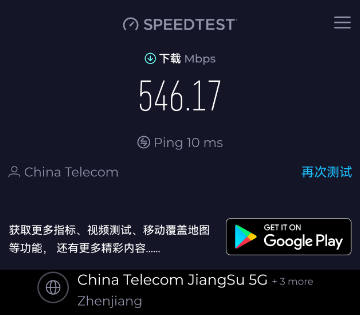 那么首先是我没有连接绿茶加速器时的基准网速,也就是我在国内正常上网的速度,测试数据为:下载速度 546.17 Mbps,Ping 10 ms;