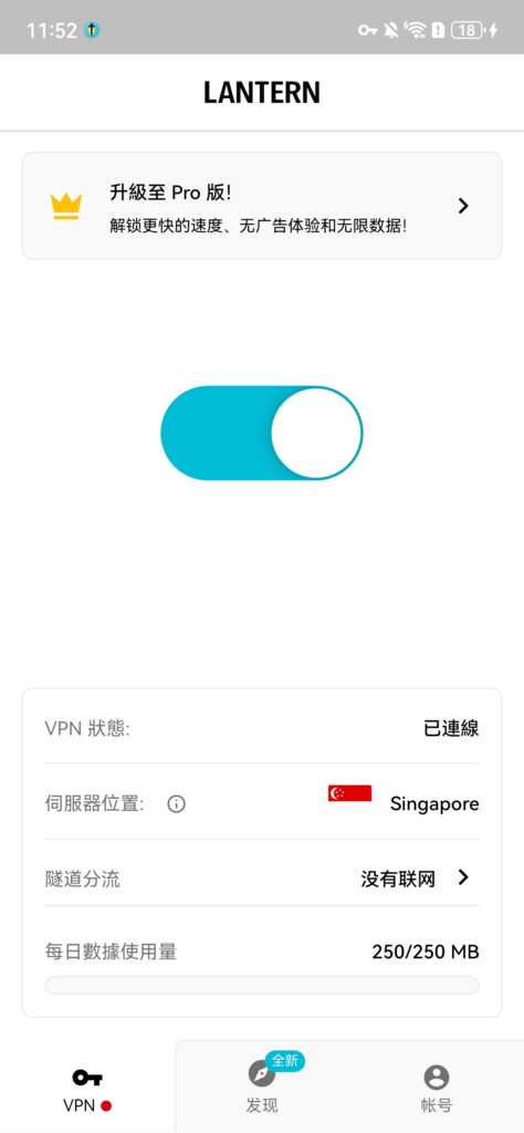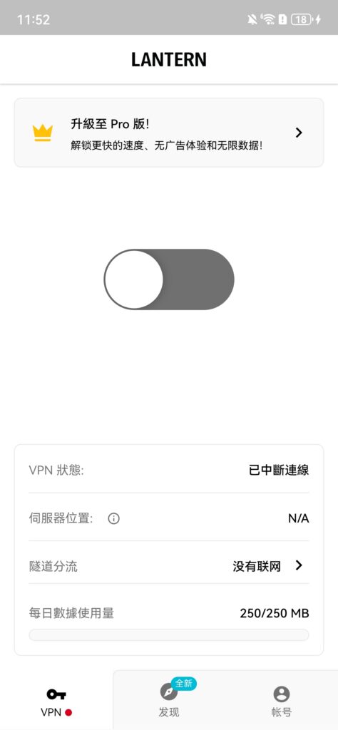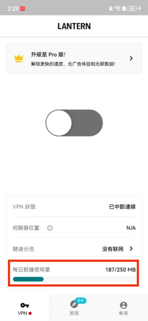 一般付费工具都会向大家提供一些免费试用机会,蓝灯也不例外,它的免费试用模式是每天都能让你用250M的流量限额,这个在应用主页里就会有进度条,你可以随时看到: