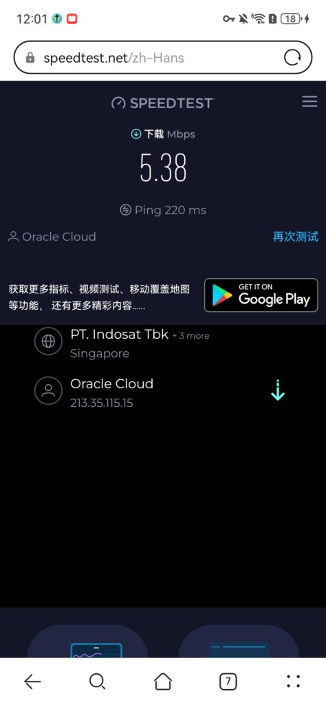 第一次测试,蓝灯加速器给我分配到了新加坡节点(是的,蓝灯加速器线路不能自选,这个我之后会详细说),我的测速结果是:下载速度 5.38 Mbps,Ping 220ms;
