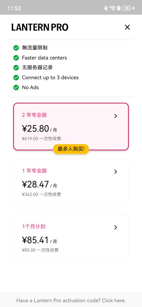 那么除了这个免费试用期限之后,还想使用蓝灯,你就需要付费购买它的会员服务了: