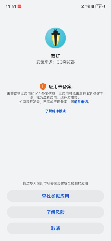 但在我连接测试蓝灯加速器的时候,我的手机系统还是选择对我进行警告,提示我此应用存在安全风险,所以我要安装,就得是“无视风险安装”。