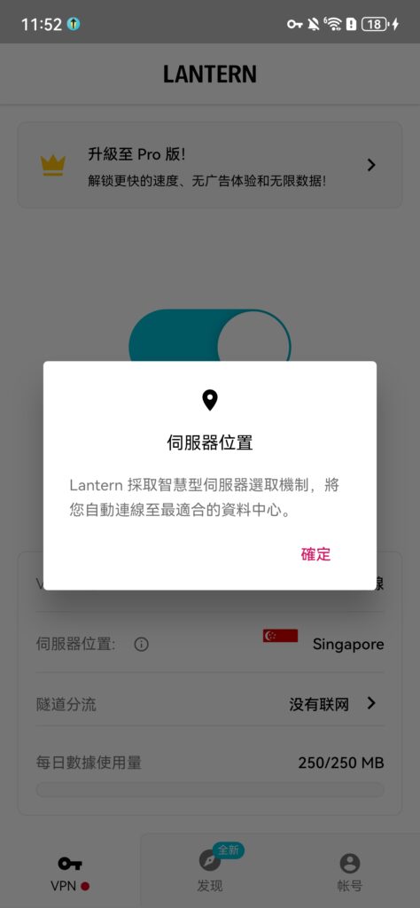 服务器方面,我在蓝灯加速器的界面内找到服务器选项,想要查看其服务器列表,但出现了右图这样的弹窗,告知我:Lantern 采取智慧型服务器选取机制,将您自动连接至最适合的资料中心。