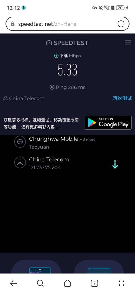 第二次测试,蓝灯给我分配到台湾节点,我的网速结果为:下载速度 5.33 Mbps,Ping 286 ms。
