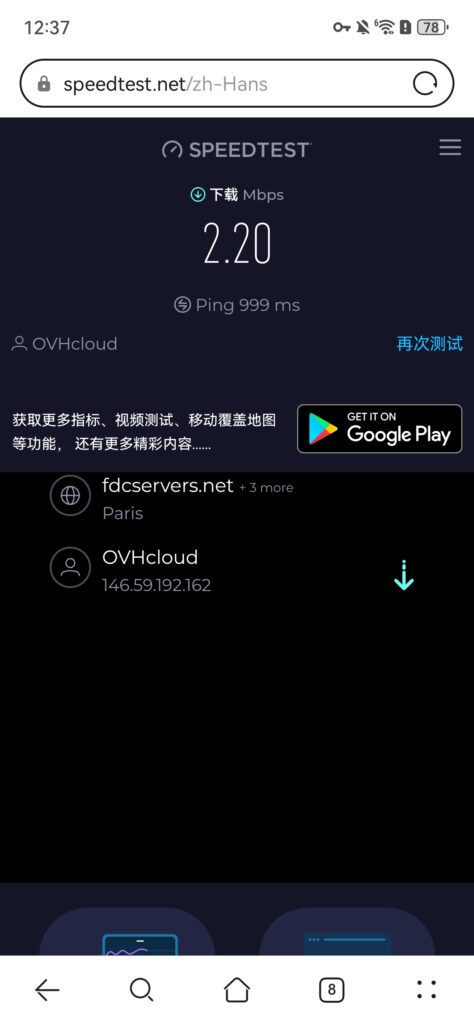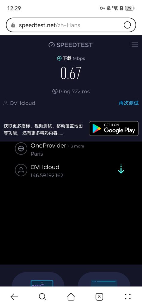 由于这个法国的测速结果里,延迟数据太过于离谱,我又补充了一次网速测试,下载速度 0.67 Mbps,Ping 722 ms。