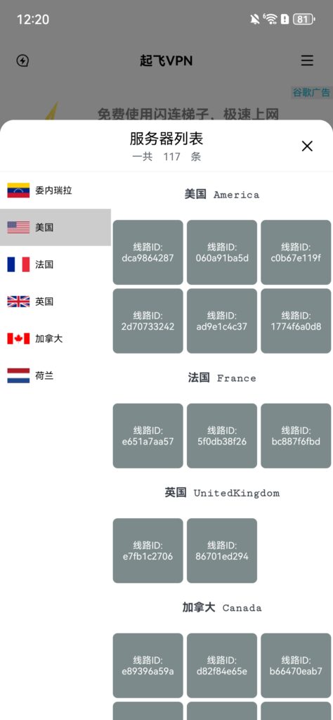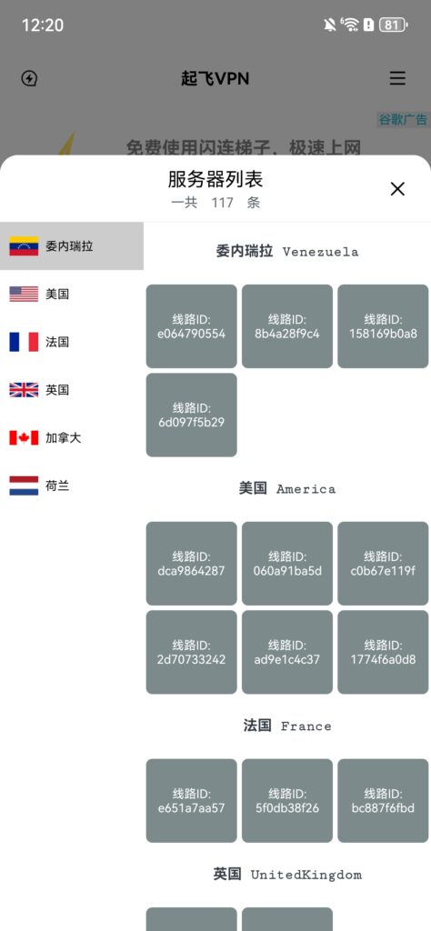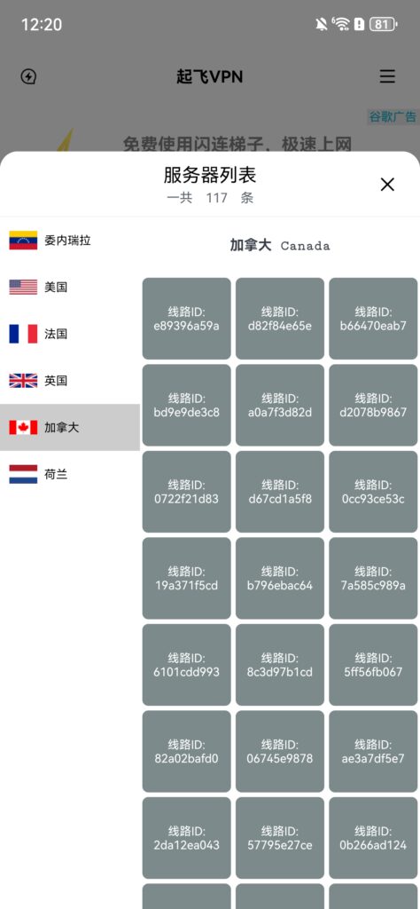 起飞加速器可以提供的服务器线路选项你可以在应用内轻松找到,如下图所示,一共涵盖六个国家,委内瑞拉、美国、法国、英国、加拿大、荷兰,数量上共计117条,其中委内瑞拉有四条,美国六条,法国三条,英国两条,荷兰一条,剩余101条全部都是加拿大线路。
