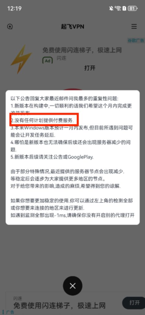 起飞加速器是一个完全免费的加速器工具,其中也反复承诺了,不会向用户收取费用,现在不会,以后也不会。