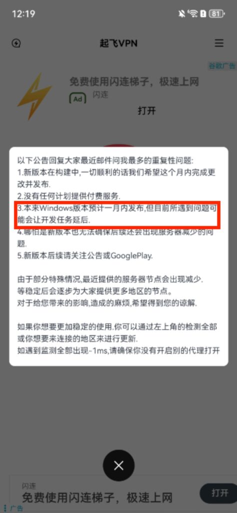 那么从这里大家也能看出来,其实起飞加速器里面的广告版本还是蛮多的,不管是主页上面、下面,都是广告窗口,连接加速器的过程里也会遇到全屏弹窗类型的广告,这也是免费加速器的通病,因为作者需要这些广告来获取利润。