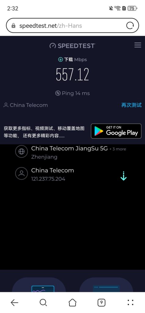 那么首先我做了第一次测试,不连接起飞加速器,我获取到的网速数据是:下载速度 557.12 Mbps,Ping 14 ms。