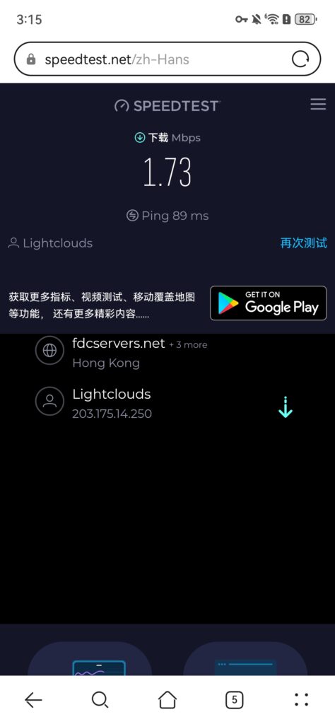 因为第二次数据差距的确过大,我又进行了第三次测速,条件都与上述条件一致,网速数据为:下载速度 1.73 Mbps,Ping 89 ms: