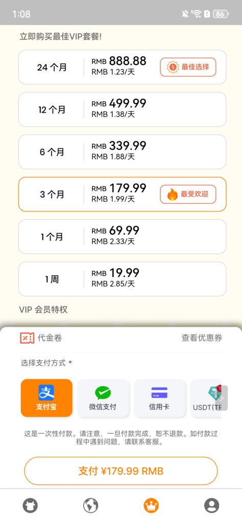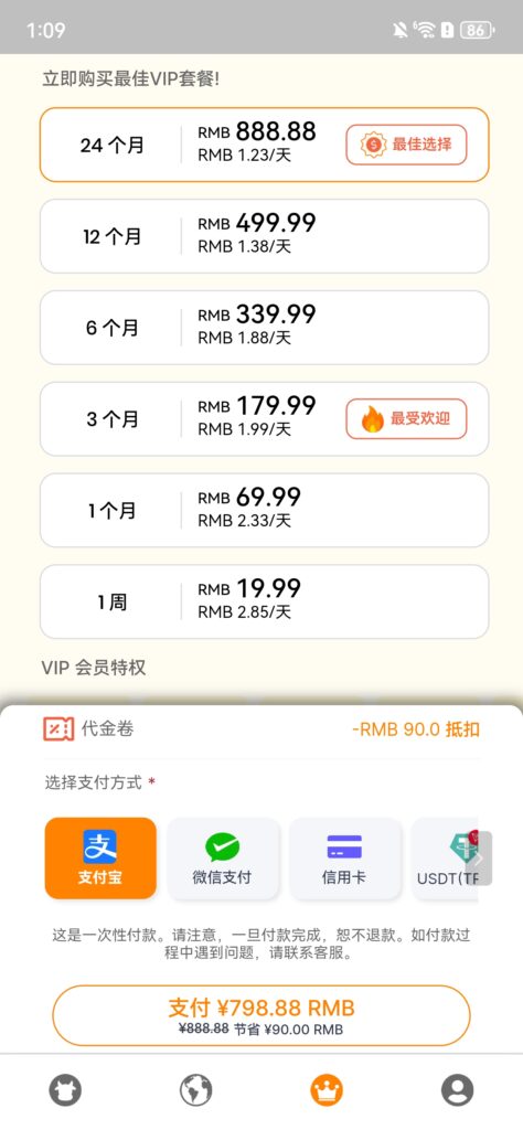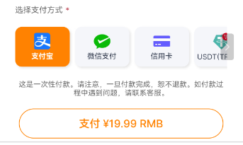 选择好中意的套餐就可以在应用内支付了,小牛加速器可以支持支付宝、微信、信用卡、USDT,付费方式还是比较全面的。