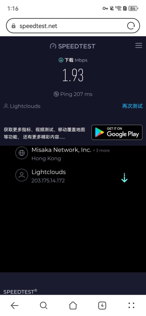 第二次,我测试的是在连接小牛加速器香港线路之后的上网速度,使用设备与网络环境都相同,获取的数据为:下载速度 1.93 Mbps,Ping 207 ms;
