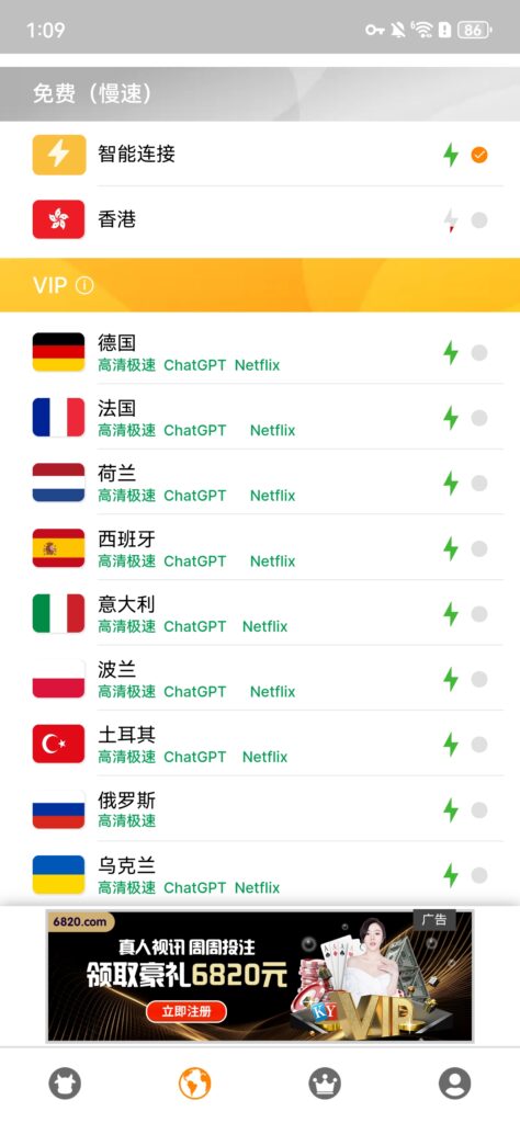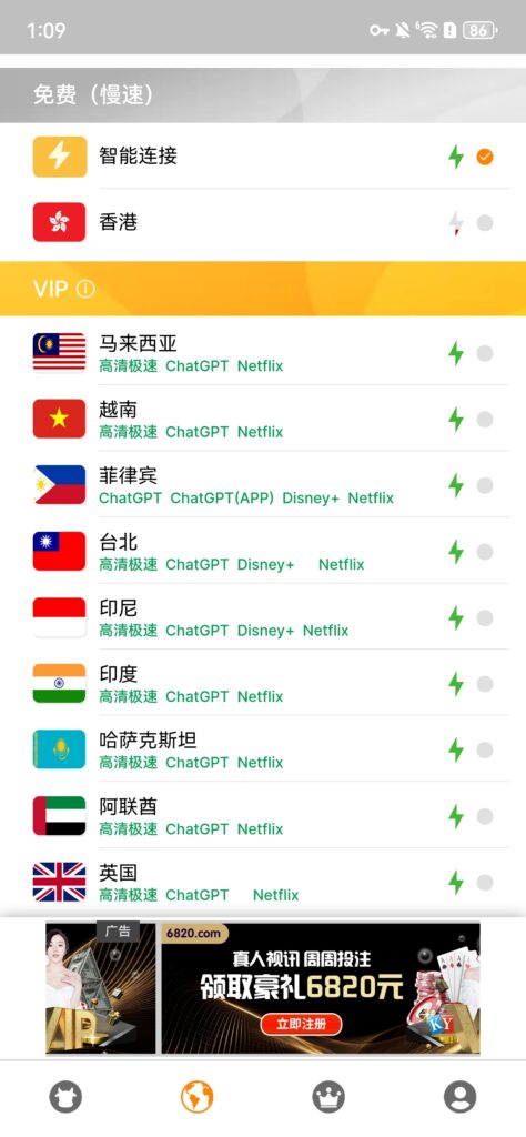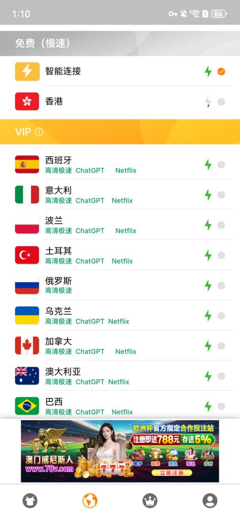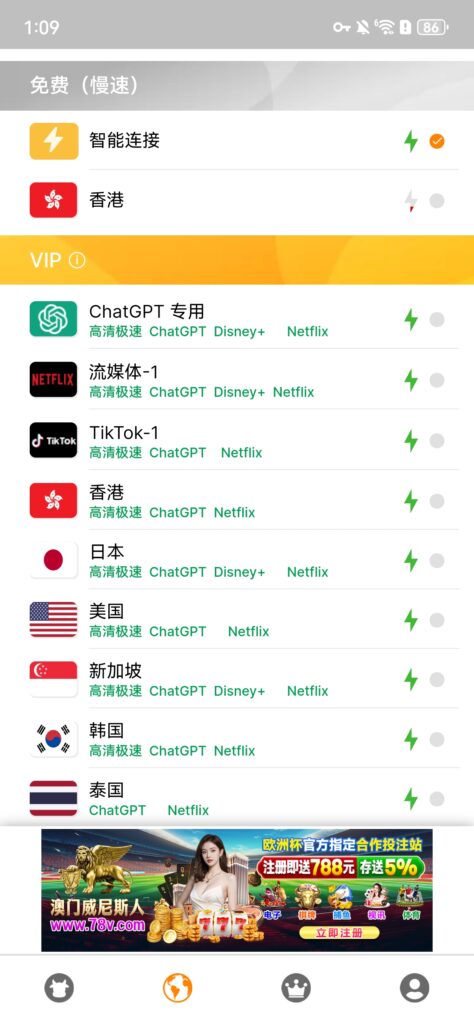 第二,就是只有 VIP 才能连接的线路,这个数量就多多了,看图也看得出来,一共有 27 个国家地区,除了热门的日本、美国这样的必备线路,还提供一些西班牙、乌克兰这样的极为小众的线路,覆盖范围基本上也能算是覆盖全球了,各大洲都有涉猎,这样的覆盖面足够满足你各类上外网需求,更别说它还能提供 ChatGPT、Tiktok、Disney+ 这样的专业流媒体线路,在选项丰富的同时还做到了数量庞大,值得点赞。