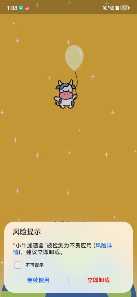 除此之外,我在及在调研测试的时候,手机也一直提示这是危险、不良应用,建议我卸载,在我测试的很多加速器里,遇到这种强烈建议我卸载的也是少数,所以写出来给大家作为一个参考吧。