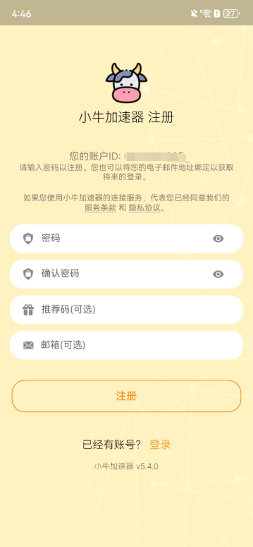 下面的截图我们还是以安卓手机为例,新用户进入后,需要先注册一个个人账号,一般来说小牛会直接分配给你一个数字 ID,你只需要给这个 ID 设置一个密码,然后点击【注册】就行,不需要绑定手机号邮箱号之类的: